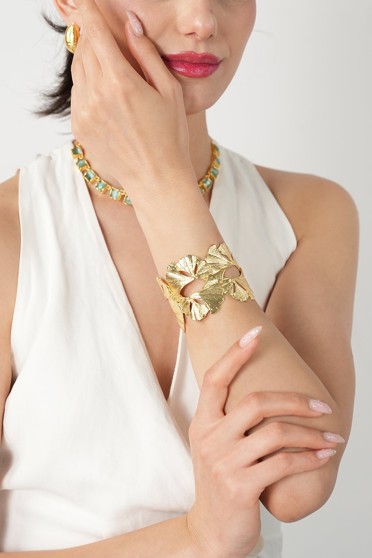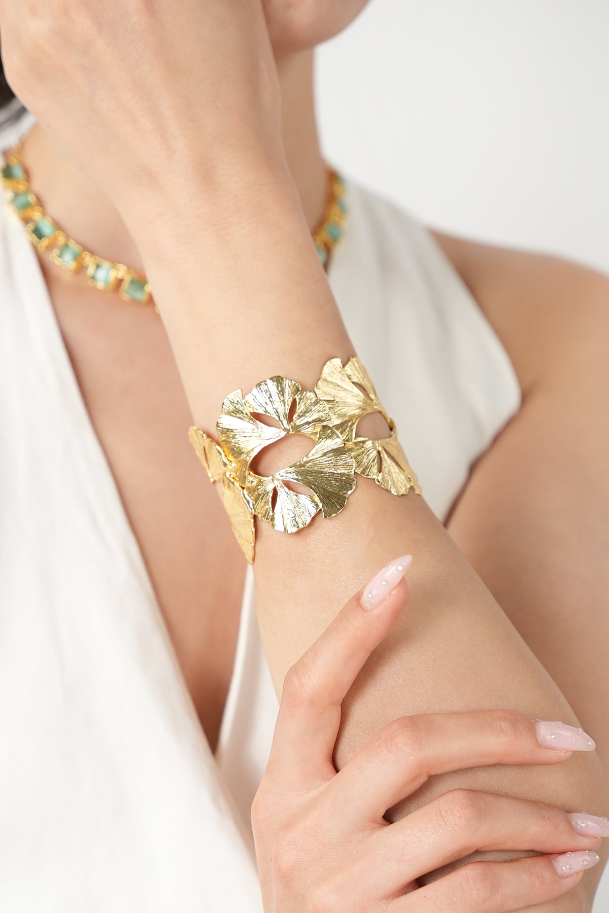 Umudun ve dayanıklılığın sembolü olan ikonik Ginkgo yapraklarının zarif formu, bu el yapımı manşet bilezikte yeniden hayat buluyor. Stilize yaprakların bir araya gelerek oluşturduğu bu organik tasarım, bileğinizi sanatsal bir zarafetle sarar.