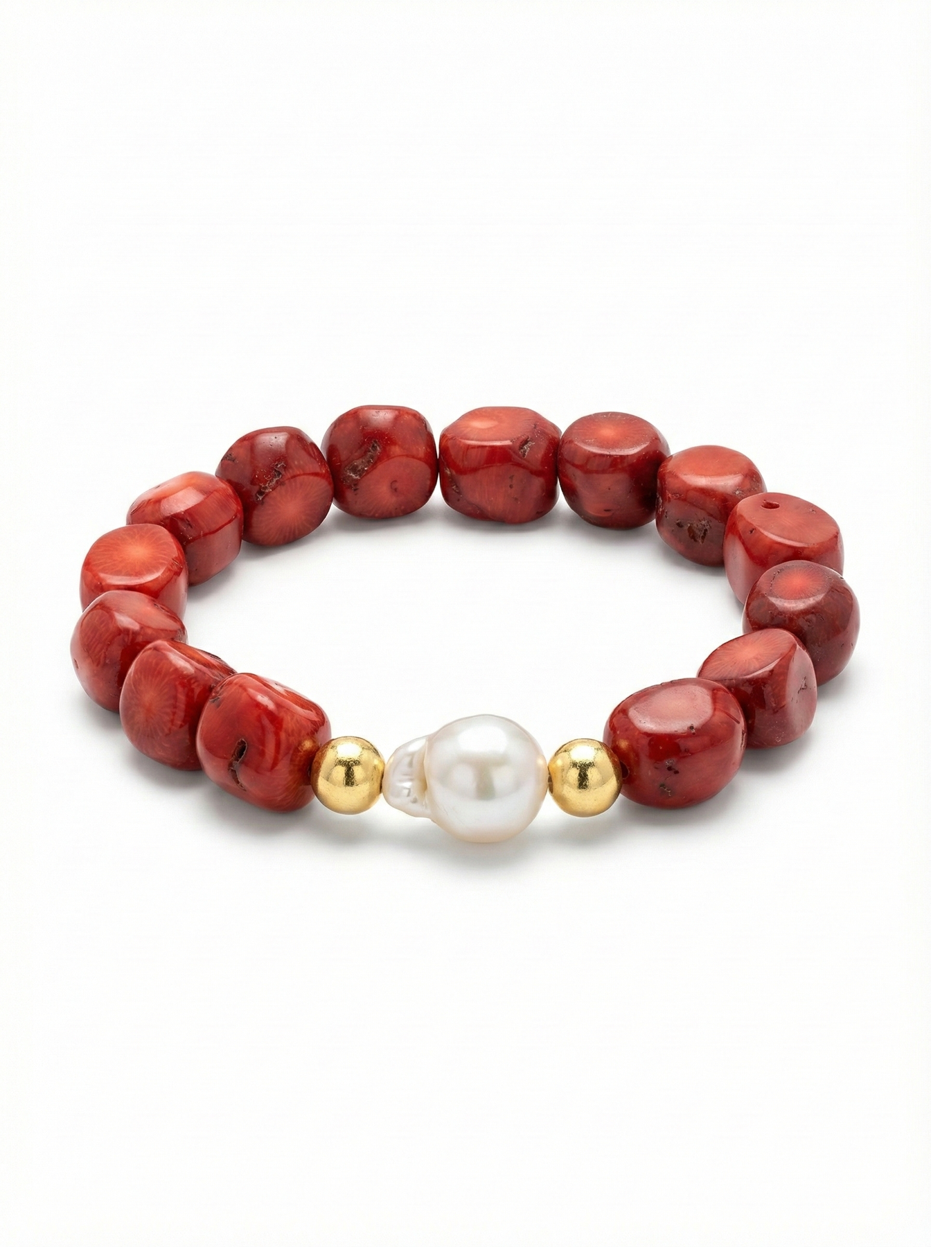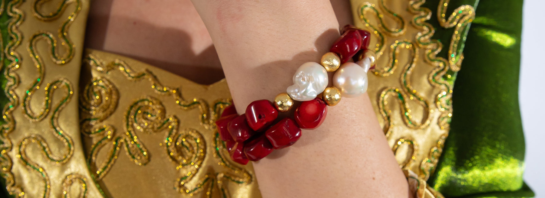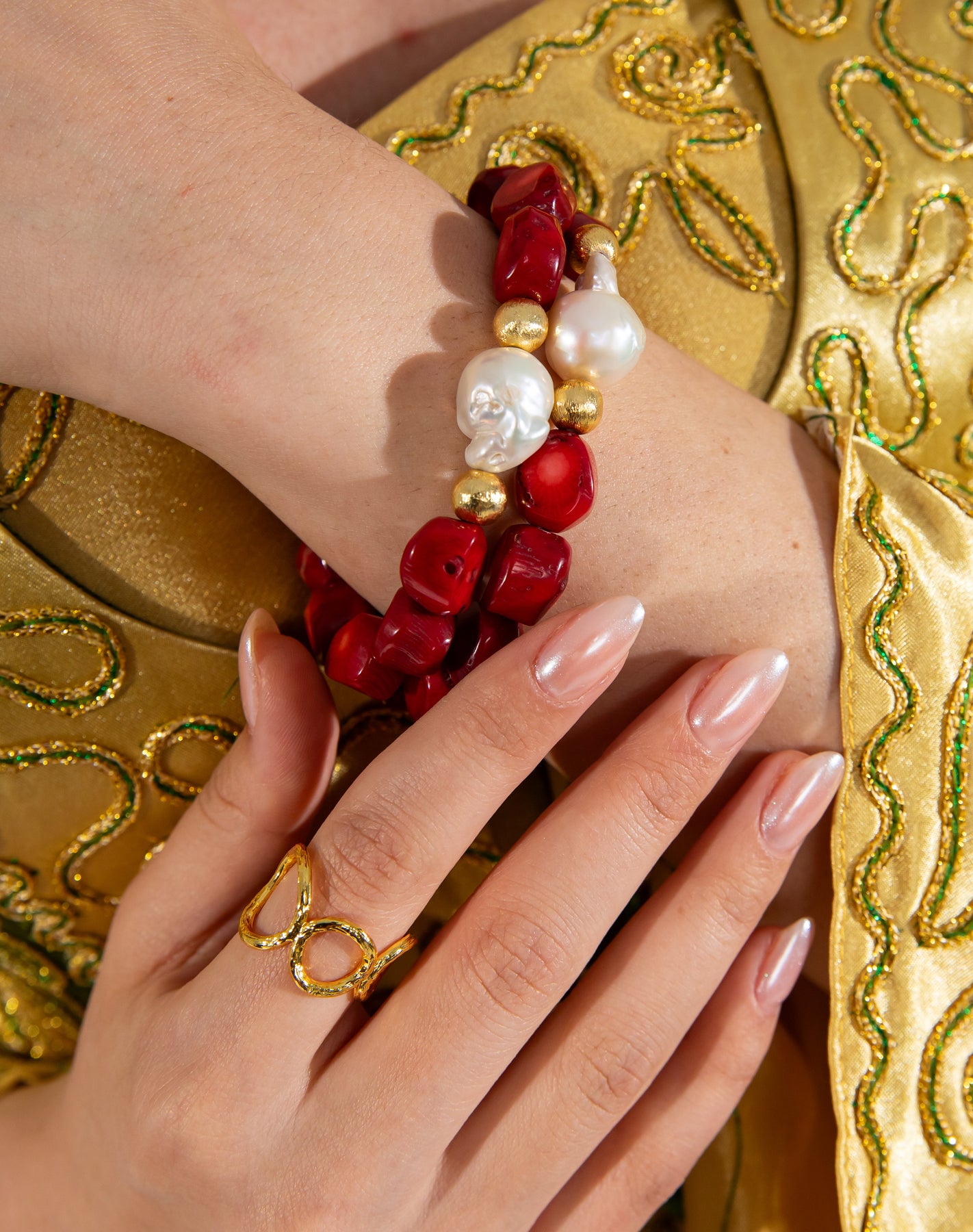 Nar tanelerini andıran kırmızı taşlar, yaşam enerjisini simgelerken; ortadaki barok inci, doğal kusurlarıyla her parçayı eşsiz kılar. 24 ayar altın kaplama detaylar, tasarıma sıcaklık ve incelik kazandırır.