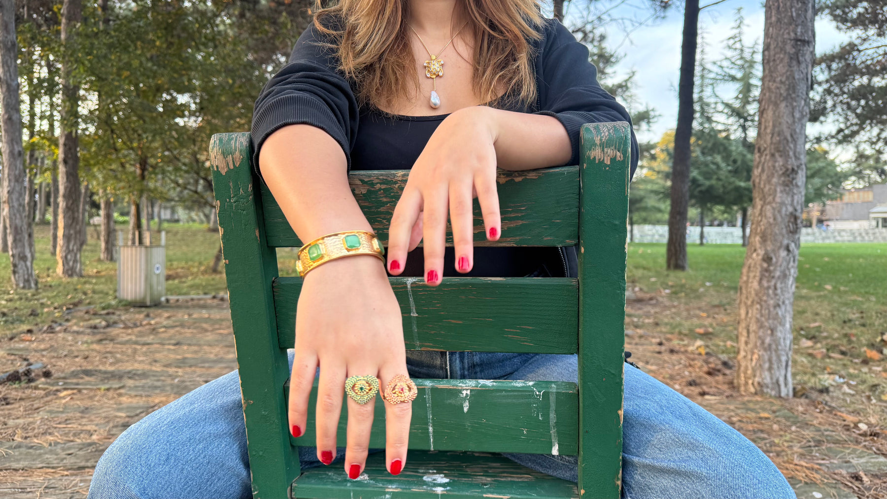 Merkezindeki stilize göz detayıyla hem modern bir tılsım hem de güçlü bir stil ifadesi sunuyor.