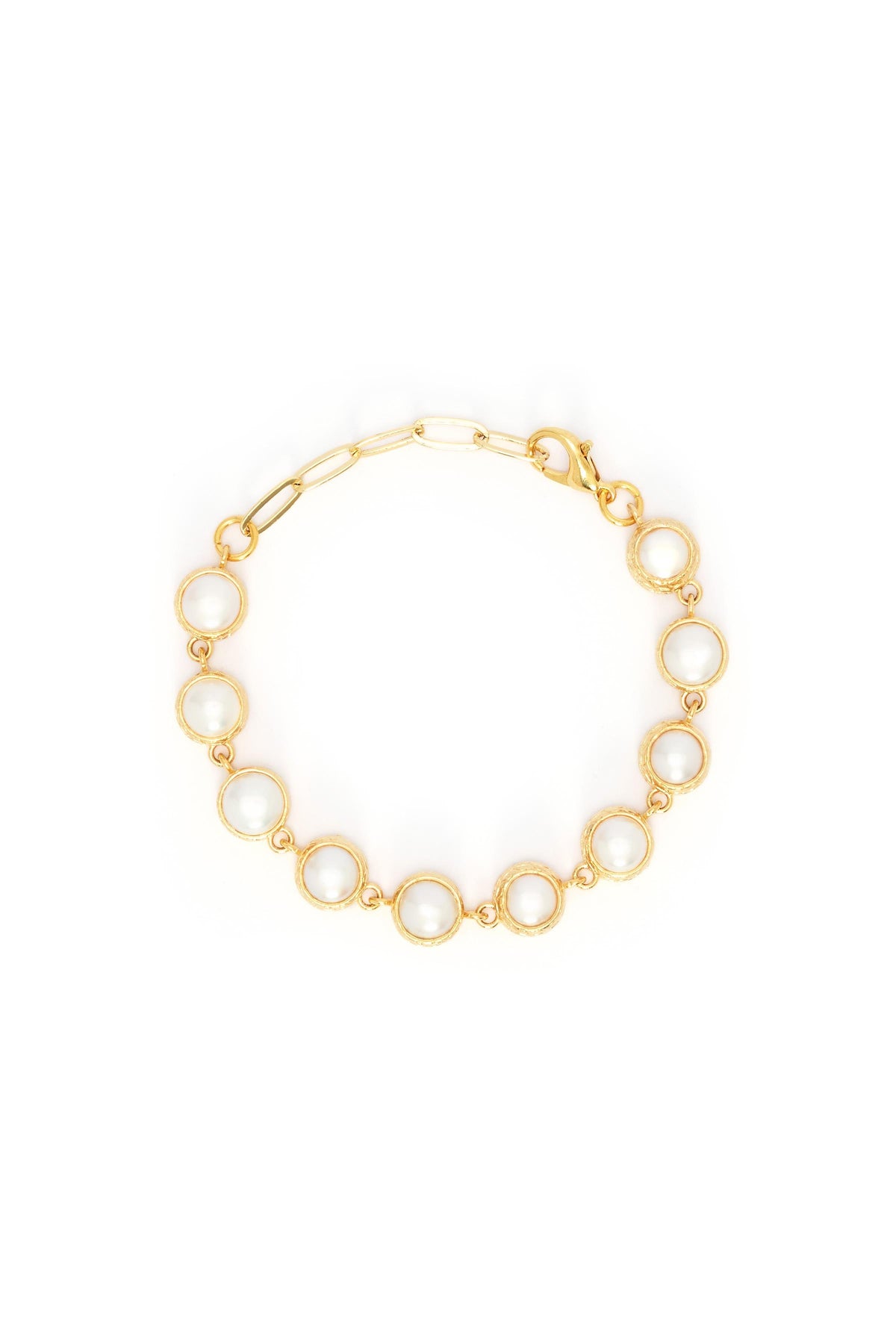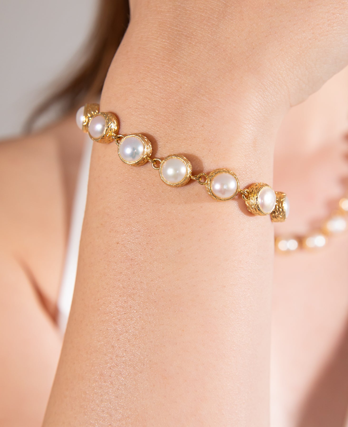 Orbitello inci bilezik, altın kaplama detayları ve yuvarlak inci formuyla zamansız bir şıklık sunar.
