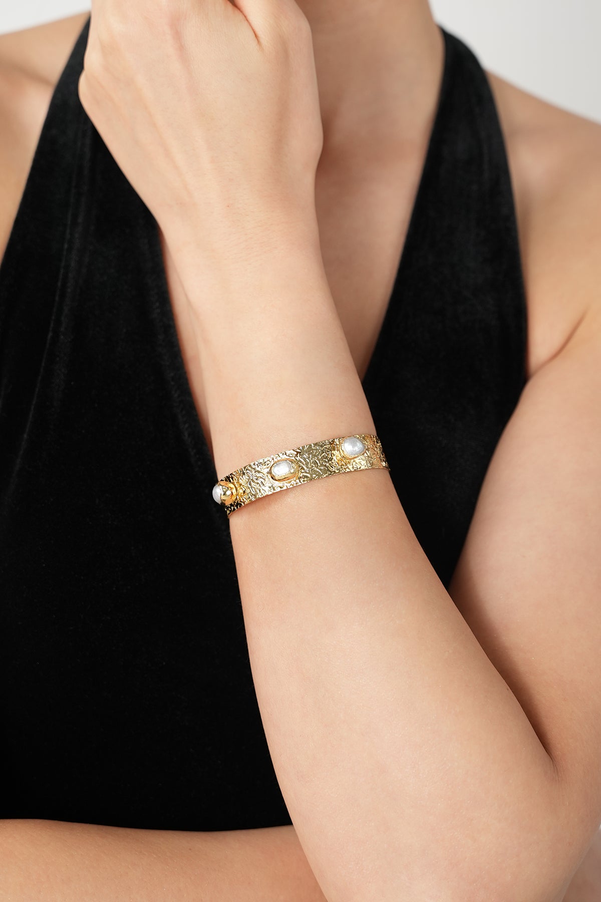 Elde işlenmiş dövme metal dokusunu inci detaylarıyla birleştiren, zamansız ve karakterli bir tasarım.