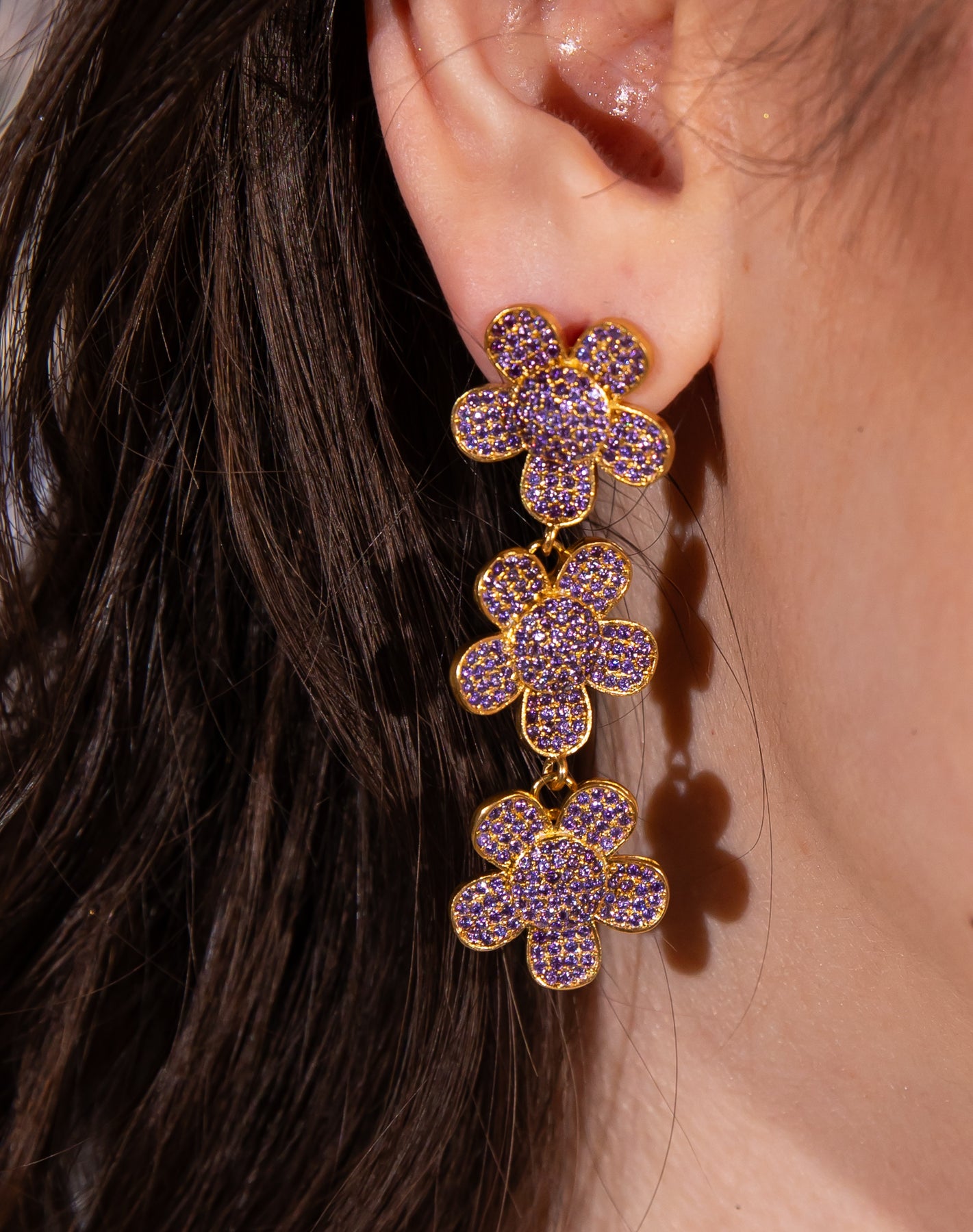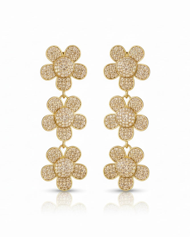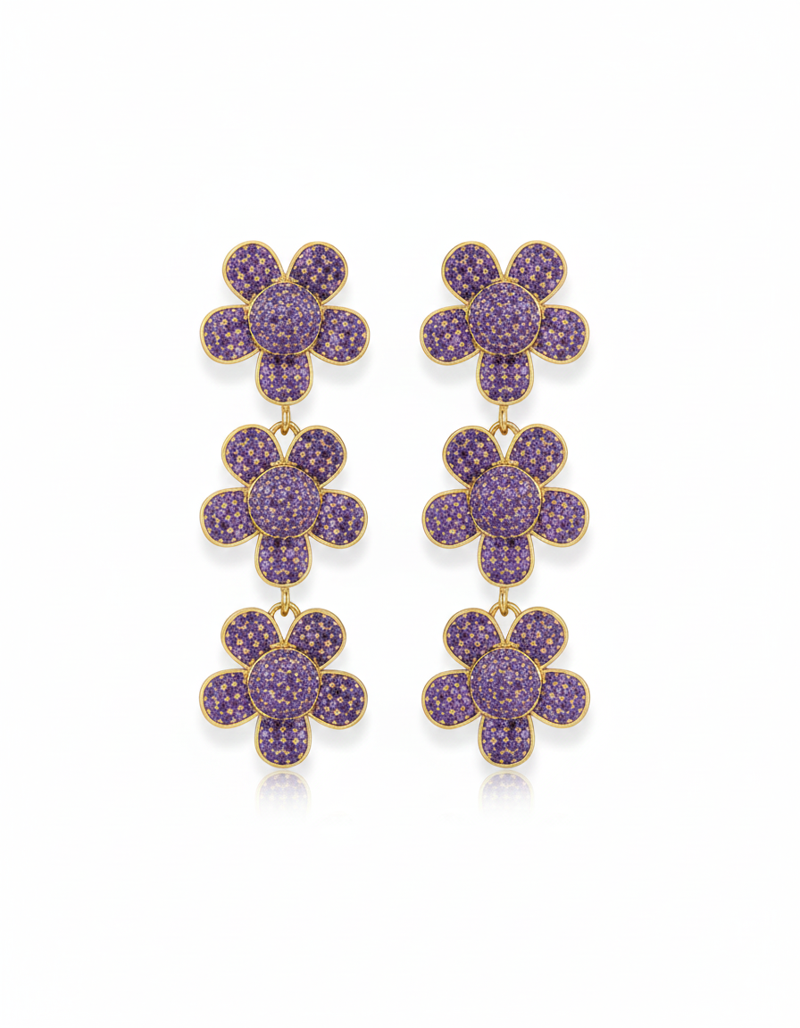 Zircona Fleur küpeler, doğanın narinliğini mücevher sanatının en parlak formuyla buluşturuyor. Bu göz alıcı tasarım, her biri ışığı yakalamak için titizlikle yerleştirilmiş binlerce mikro-zirkon kristaliyle kaplanmış üç katmanlı çiçek motifinden oluşur.