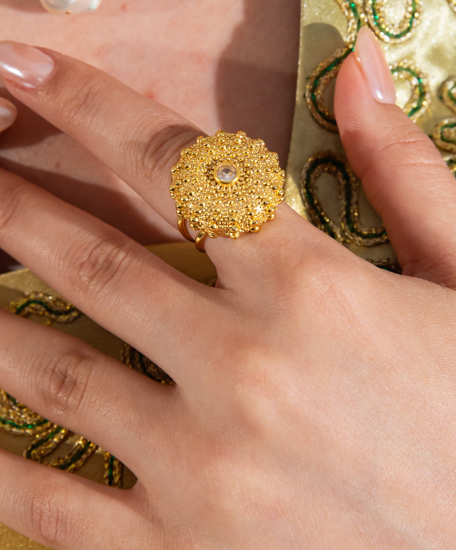 El işçiliğiyle şekillendirilen kabartılı yüzey, altın kaplama ışığı en doğal haliyle yansıtmasını sağlar.